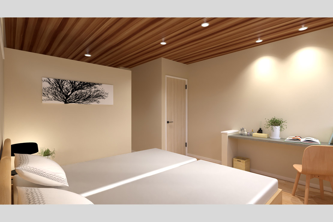 寝室にはカウンターを設置し、天井にアクセントクロス