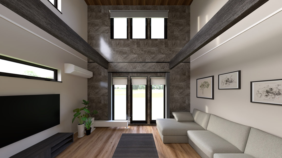 7.5帖大の吹き抜けの壁面は、調湿/消臭効果もあるエコカラット貼り