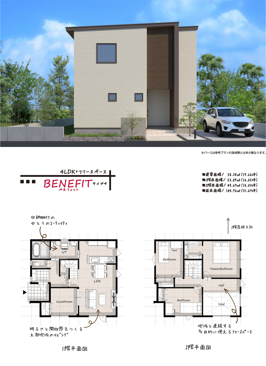 ※価格には外部給排水、地盤調査費それに伴う特殊基礎・杭打工事等の建築場所の条件により異なるもの及び屋外電気工事、ガス配管工事、外構工事、各手続き申請料、税金登録に関わる諸費用は含まれません。