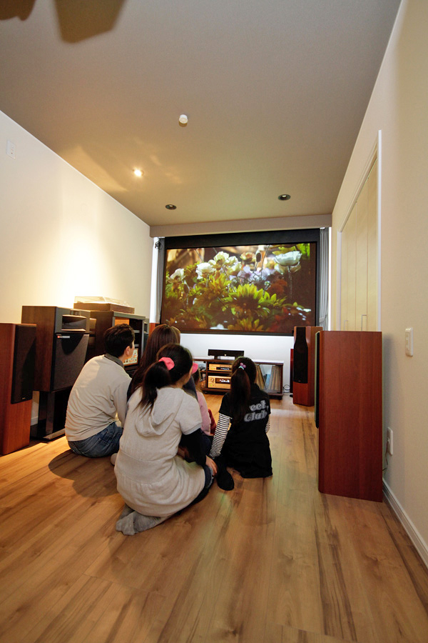 ご主人の希望をかなえたホームシアター。1階に設けたことで、音の響きがあまり気にならず、心ゆくまで音楽や映画を楽しむことができます。「年末には家族全員でクリスマスの映画を観たいですね」
