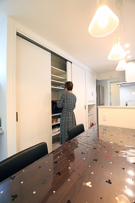 完成したO邸は、奥様のイメージ通り家具がほとんどなく、モダンな佇まいに。自慢はキッチンの背面に設けた大型収納。生活感を見せないために、電化製品や食器、ストック用の食材など、キッチン周りで使うものを引き戸の中に収められるようにしました。また、ダイニングスペースは、リビングから見えにくい配置にして、家族の食事時間がばらばらだったり、来客があったときでも、落ち着いて食事ができるようにしました。