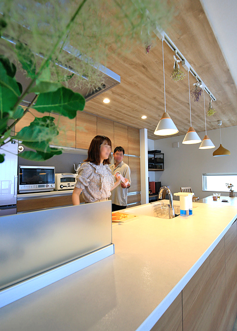 Sさんご夫妻の要望の一つが、アイランドスタイルのキッチンにすることでした。ともに料理を趣味とするSさんご夫妻にとって、夫婦で並んでキッチンに立つことができ、動線がスムーズなアイランドキッチンは必須ともいえる条件でした。「アイランドキッチンは広い間口が必要で、レイアウトも制約されてしまいます。そのため、以前に他のハウスメーカーにプランニングを依頼したときは、思ったようなイメージにはなりませんでした。ところが、クワザワの担当の方から提案されたプランは、まさに理想通り。見た瞬間に『これだ!』と感じました」とご主人。いろいろな要望を伝えたにもかかわらず、予算内に収めてくれたことにも驚いた、と振り返ります。